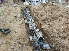 В траншею укладываем арматурную сетку, приварив её к только что вкрученным сваям.
